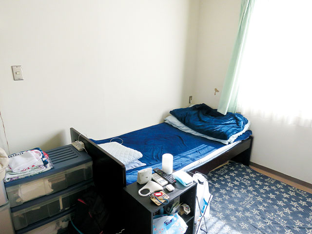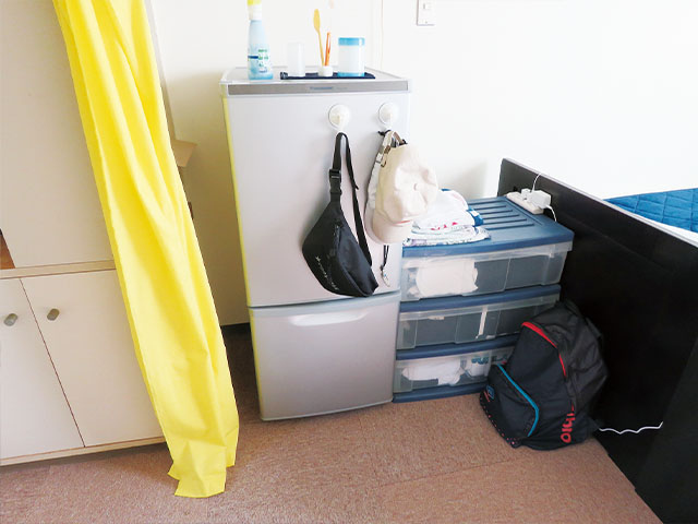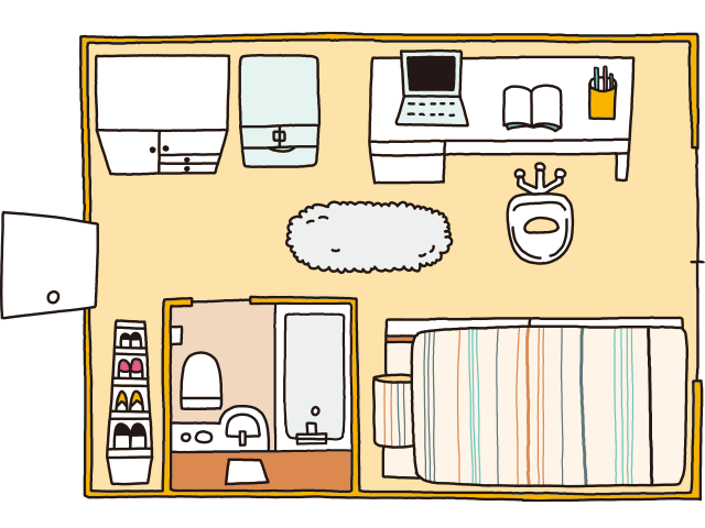 各個室には、照明、机、椅子、クローゼット、収納棚、冷蔵庫、エアコン、ベッド(敷き、掛け布団は除く)が備え付けてあります。