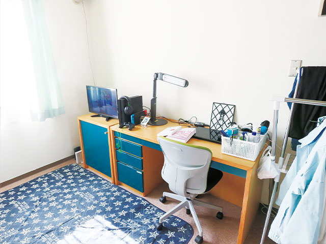 通学時間が短いので、授業の復習や課題などやるべきことに時間を充てられます。寮は1日3食付きで、カツ丼やラーメンなど満足度の高いメニューが豊富。部屋では筋トレやゲームをして過ごしています。仲間と一緒に勉強できるのも、寮生活を送る醍醐味のひとつです。