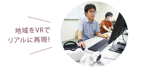 「第4回全国電子工学系学校ゲーム制作コンペティション」に参加し、大会で学んだ技術を応用して、さらに高度なVRアプリケーション製作に取り組みました。学祭で披露した体験型のVRは、Unity、Visual Studioといったツールを用い、Blenderによる建物、キャラ構築によって作成しており、動作状況についてもVR機器単体で動作させるよう改良しています。
